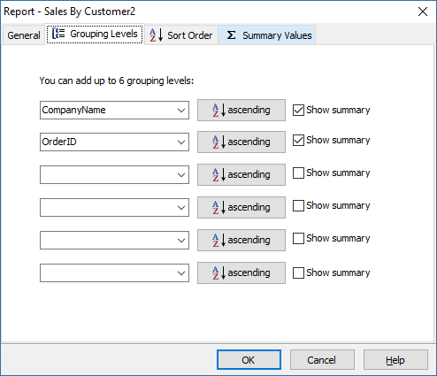 Then we create the same Summary Report as in above tutorial, we name it as, say, "Sales By Customers 2". Note that there are 2 grouping fields: