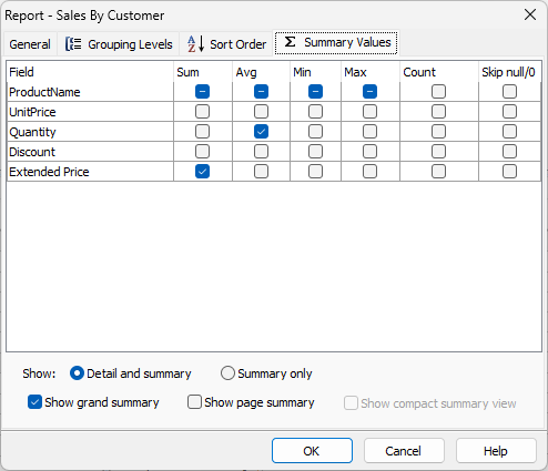 If you want to show summary only (that is, only show the grouping fields and summary values), you can select Summary only and Show compact summary view.