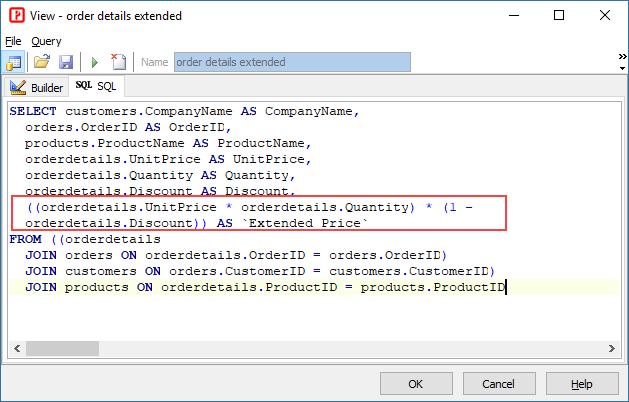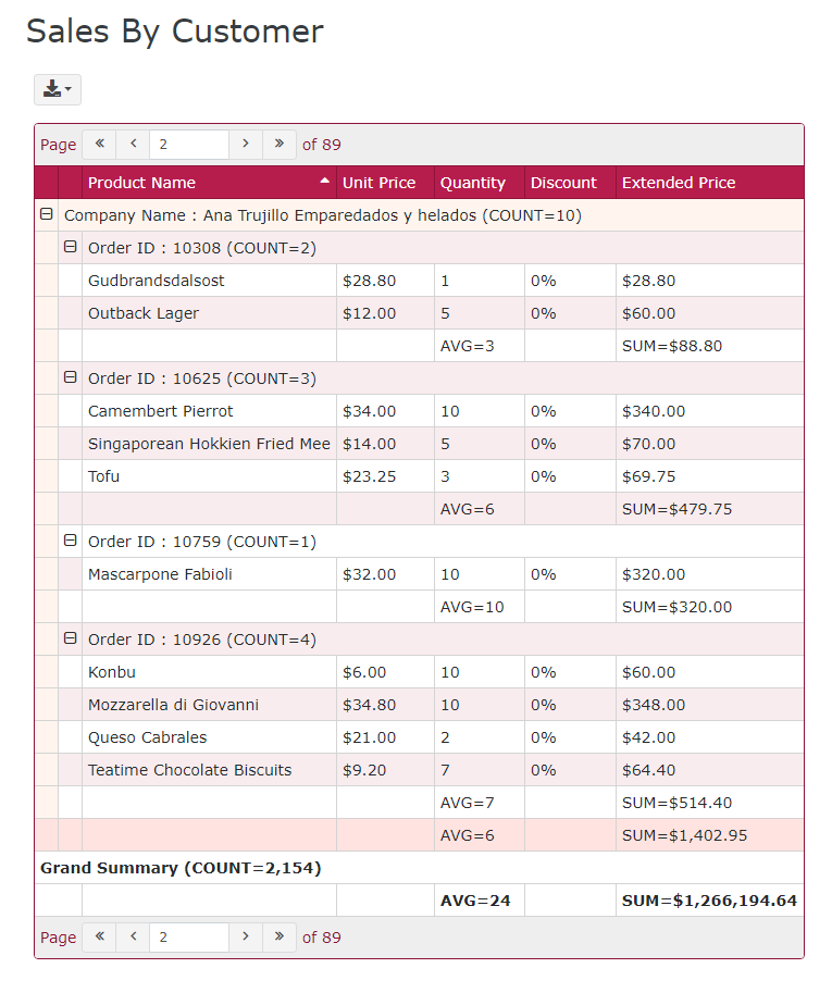 We will use the view "order_details_extended" to create a report which shows the order items in orders of each customer: