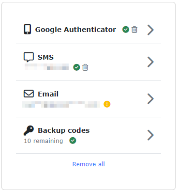 Before any type can be used, the user needs to verify the account of the type. If the account is not verified (the email address or phone number from project settings or users table are NOT considered as verified), an "unverified" icon  will be shown. The user needs to click the authentication type and verifiy. For Google Authenticator, see [First time use with Google Authenticator](twofactorauth.html?id=first-time-use-with-google-authenticator) below. For email or SMS type, an OTP will be sent to the email address or phone number for verification. Once verified, the "verified" icon  will be shown and the account can then be used for 2FA.